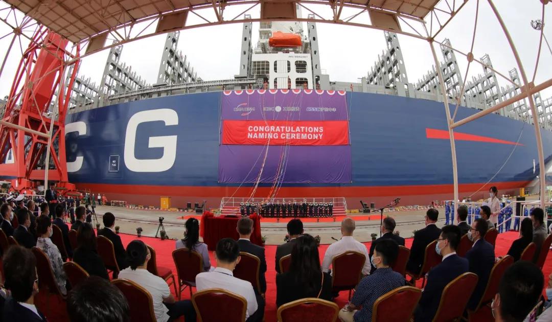8月27日,由中國船舶集團(tuán)有限公司旗下滬東中華聯(lián)合中船貿(mào)易為法國達(dá)飛海運(yùn)集團(tuán)建造的15000TEU超大型集裝箱系列船首制船“達(dá)飛·和風(fēng)”號命名交付。這是中法兩國船海巨頭全面落實2019年中國國家主席習(xí)近平和法國總統(tǒng)馬克龍見證簽署的戰(zhàn)略合作框架協(xié)議的最新成果。同時,也標(biāo)志著“CSSC超大型箱船譜系”又添“新丁”,實現(xiàn)了對全球超大型集裝箱船發(fā)展的引領(lǐng)。