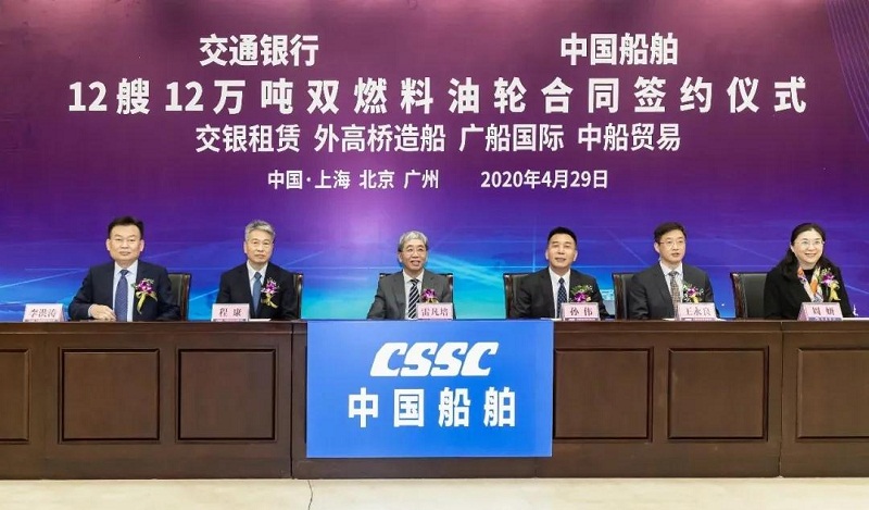 ????4月29日,中國船舶集團有限公司旗下中國船舶工業(yè)貿易有限公司、上海外高橋造船有限公司、廣船國際有限公司與交通銀行股份有限公司旗下交銀金融租賃有限責任公司在北京、上海、廣州三地以“云簽約”方式簽署12艘12萬噸雙燃料油船建造合同,合同總金額約46億元人民幣,這是中國船舶集團旗下單位近期承接的又一單筆大額訂單。中國船舶集團黨組書記、董事長雷凡培,交通銀行黨委書記、董事長任德奇,中國船舶集團黨組成員、副總經(jīng)理孫偉,交通銀行黨委委員、副行長呂家進出席簽約儀式。
