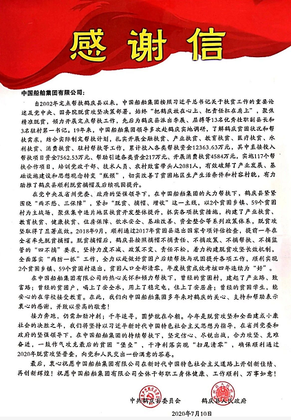 近日,中國(guó)船舶集團(tuán)收到了一封來(lái)自云南鶴慶的感謝信。從初識(shí)到現(xiàn)在,我們已在脫貧攻堅(jiān)的戰(zhàn)場(chǎng)上,攜手奮戰(zhàn)19載,如今正一鼓作氣攻克最后的貧困“堡壘”。