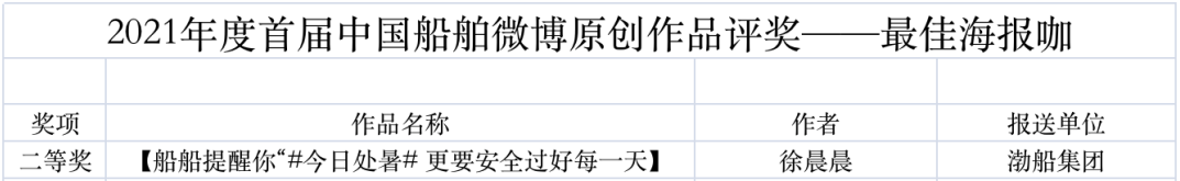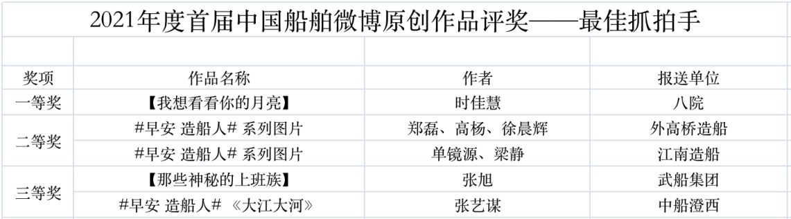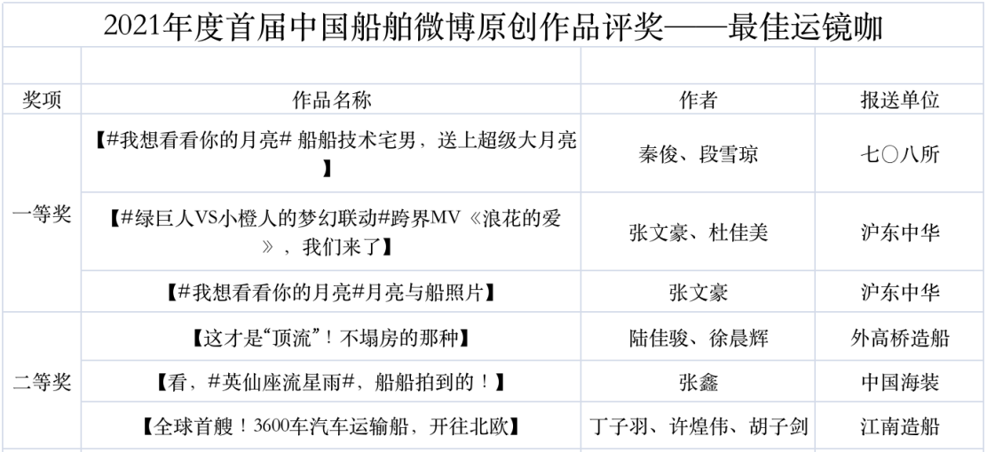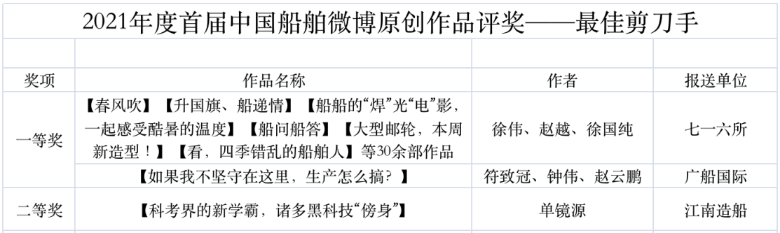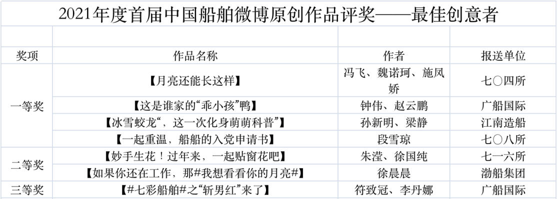 為鼓勵(lì)更多成員單位積極加入到中國船舶集團(tuán)新媒體平臺(tái)的宣傳中來,在集團(tuán)公司黨群工作部的指導(dǎo)下,中國船舶報(bào)社從不同維度,對(duì)2021年度各單位支持“中國船舶”微信的力度進(jìn)行了梳理統(tǒng)計(jì),并利用微博政務(wù)的全國專家?guī)煸u(píng)審資源,對(duì)2021年度“中國船舶”微博原創(chuàng)作品進(jìn)行了專業(yè)評(píng)審,評(píng)選結(jié)果公布如下: