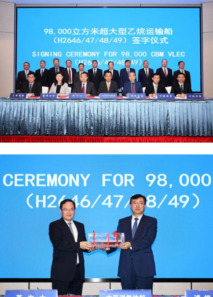 11月2日,中國船舶集團(tuán)旗下江南造船(集團(tuán))有限責(zé)任公司承建的,山東海洋集團(tuán)下屬太平洋氣體船4艘超大型乙烷運(yùn)輸船項(xiàng)目簽約儀式在上海舉行。中國船舶集團(tuán)黨組副書記、總經(jīng)理?xiàng)罱鸪桑h組成員、副總經(jīng)理孫偉,山東海洋集團(tuán)黨委書記、董事長姜國棟,黨委委員、副總經(jīng)理于冰出席儀式。