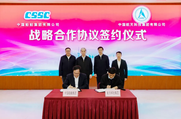 12月7日,中國船舶集團有限公司與中國航天科技集團有限公司在京簽署戰略合作協議。中國船舶集團黨組書記、董事長雷凡培,黨組副書記、總經理楊金成,黨組成員、副總經理錢建平,航天科技集團黨組書記、董事長吳燕生,黨組副書記、總經理徐強,黨組成員、副總經理張忠陽出席簽約儀式。楊金成、徐強分別代表雙方在協議上簽字。