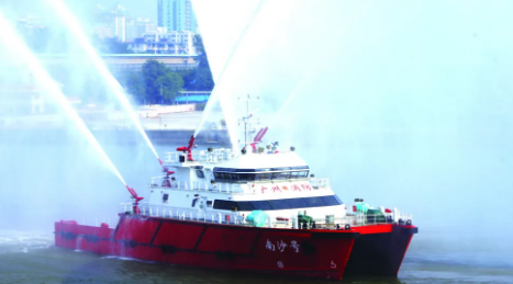 2010年12月28日,廣船國(guó)際為南沙區(qū)建造的“南沙號(hào)”消防船投入使用。“南沙號(hào)”消防船總長(zhǎng)46米,型寬15米,排水量達(dá)到680噸,航速可達(dá)32.4公里/小時(shí),共設(shè)置有6門(mén)水炮。其中,2門(mén)主炮射程可達(dá)到150米,4門(mén)副炮射程可達(dá)到130米;還設(shè)置了全船水幕保護(hù)系統(tǒng),在火災(zāi)現(xiàn)場(chǎng)可有效保護(hù)自身安全?!澳仙程?hào)”消防船是當(dāng)時(shí)國(guó)內(nèi)最大雙體專勤消防船,大大增強(qiáng)了對(duì)船舶火災(zāi)、石化碼頭、油庫(kù)火災(zāi)的撲救能力。