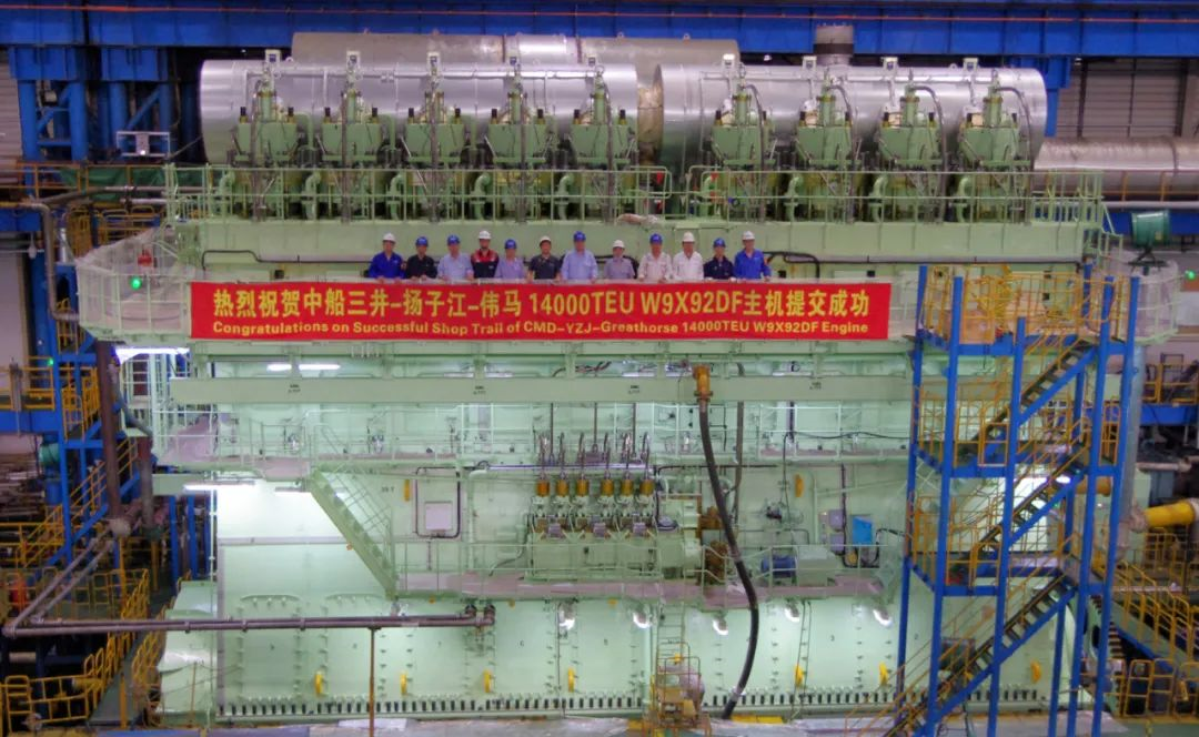 CMD-WinGD 9X92DF雙燃料主機(jī)最大功率42560kW,由中船動(dòng)力集團(tuán)下屬溫特圖爾發(fā)動(dòng)機(jī)有限公司研發(fā),上海中船三井造船柴油機(jī)有限公司生產(chǎn)制造將安裝在14000TEU集裝箱船上