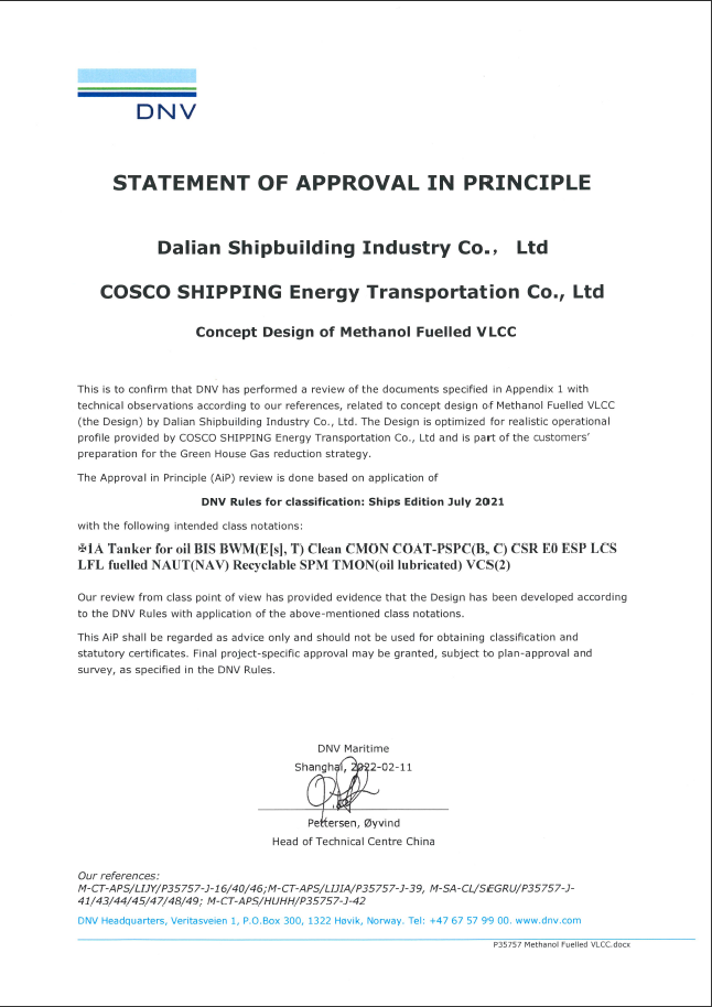 甲醇燃料VLCC分別獲得DNV、CCS船級(jí)社AIP認(rèn)可。