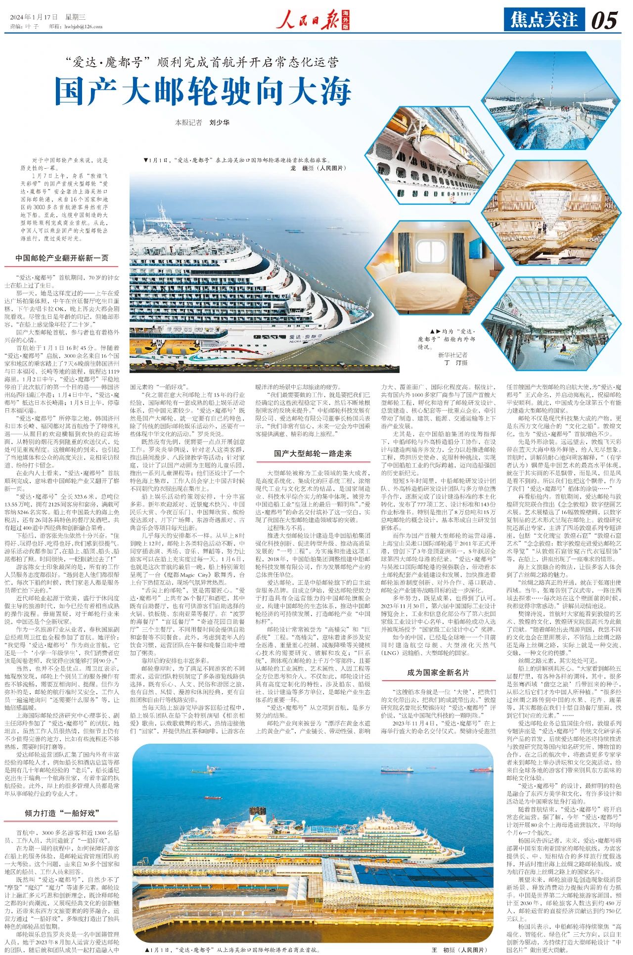 1月17日,人民日?qǐng)?bào)海外版第五版焦點(diǎn)關(guān)注刊發(fā)整版文章,聚焦“愛達(dá)·魔都號(hào)”。